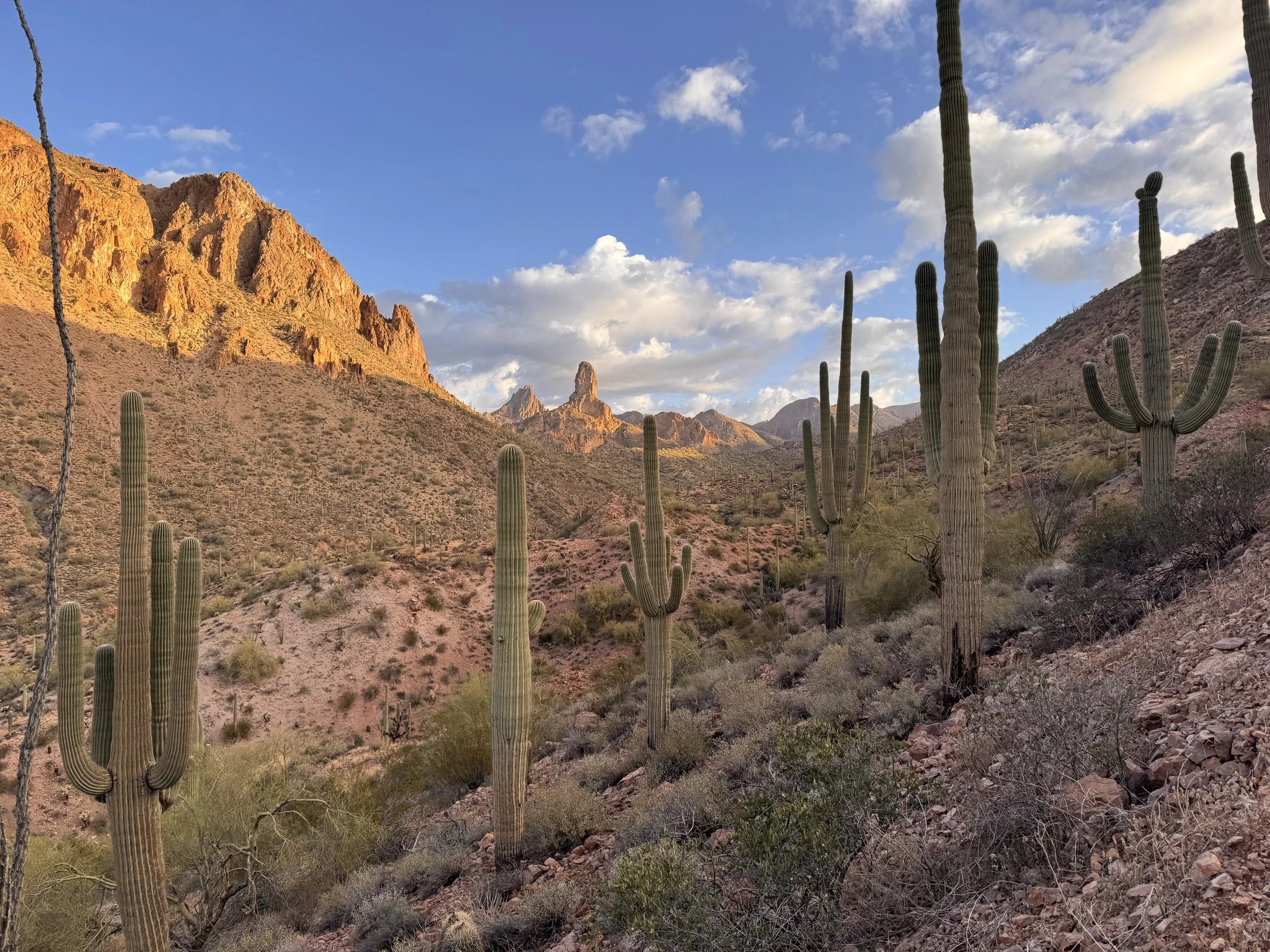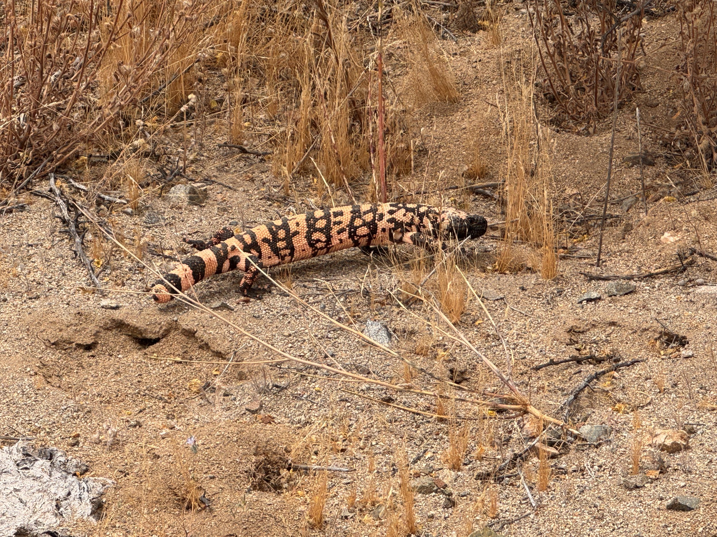 This next stretch is a short one. Barely a day and a half. I left the trail angel’s house around 1130 after a relaxing morning in bed and was hiking a little before noon. I had about 15 miles to go. I planned to camp at the end of the Gila River stretch. Some people will walk the railroad tracks through here instead to avoid the ups and downs, but I’m glad I didn’t. The trail was beautiful following the lower edge of the mountains near the Gila river. There were tons of saguaro, prickly pear, and different cholla cacti all around, some of which were blooming still. I finally saw my first Gila monster in this stretch! It was the one animal I wanted to see most this trail, other than an ocelot, but the odds are basically no for that. It was decent sized and a peachy orange. I was able to get a photo before it ambled off to its home. The Gila monsters live in the dry deserts of North America and come out infrequently. They spend most of their time underground.