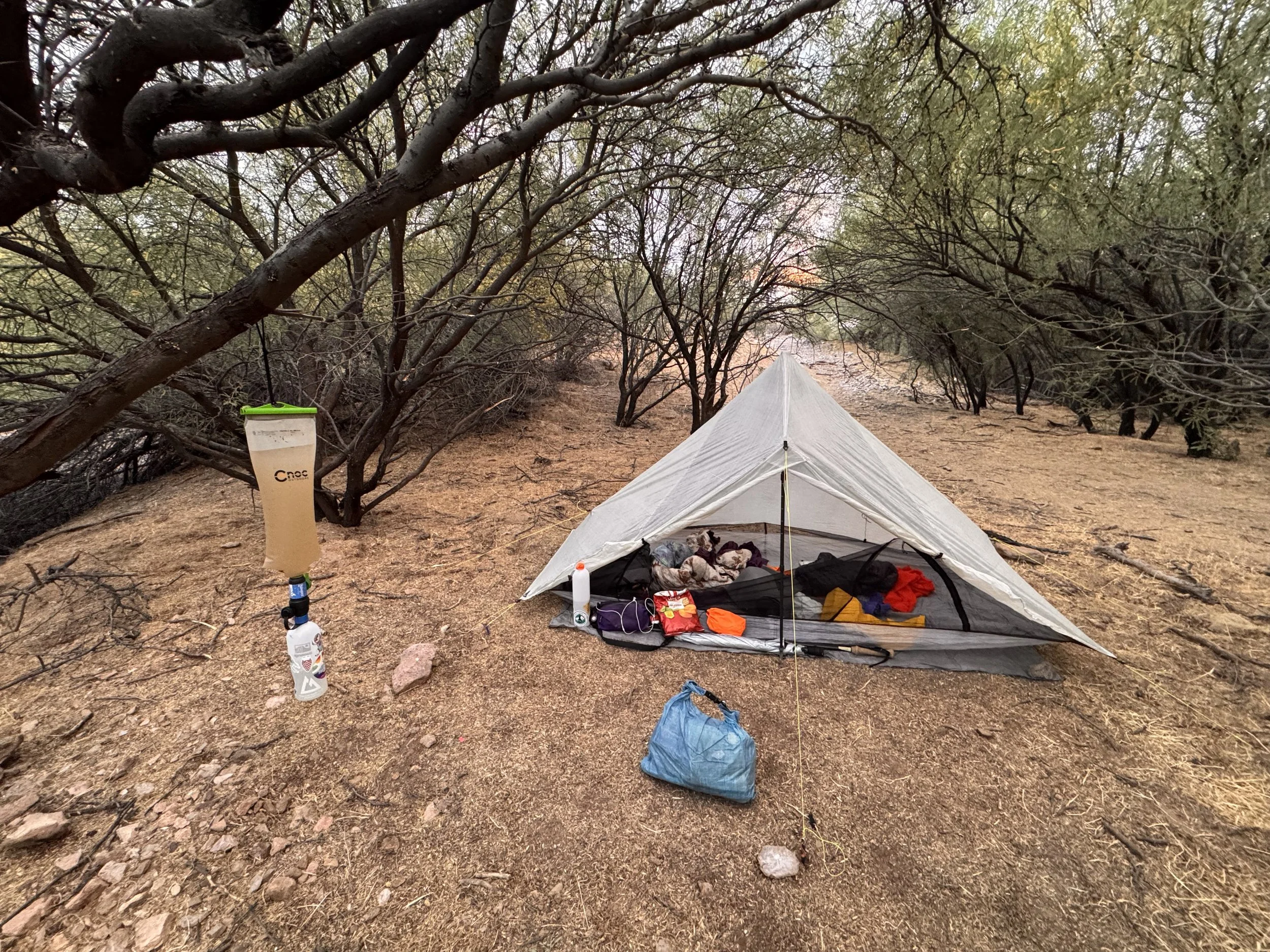 I listened to a book until I left cell service. I didn’t realize the book never fully downloaded so I turned on a different one. Later in the day around 1730, I tried to blow a snot rocket out of my nose, but unleashed a torrent of blood instead. The dry air was likely the main factor in my nose suddenly becoming a leaky faucet. It dripped rapidly onto the trail before I pulled out a napkin I had. I rarely have things like napkins with me so it was lucky I did. As I hiked on, I quickly bled through it and had to stop again to pull out the paper towel I happened to also have. I got it at the pizza place, but didn’t use it so it came with me. Also unusual that I had it as well. I shoved it up my nose and continued on. It actively bled for half an hour, soaking my paper towel. Luckily I didn’t have far until camp. I reached the last Gila River access where I planned to stay. I dropped my pack where I planned to set up camp then went to the river for some very silty and probably industrial waste polluted water. Back at camp I set up my tent, filtered water, ate, and relaxed. I should be in town around 1500 the next day. Only 22 miles to go.