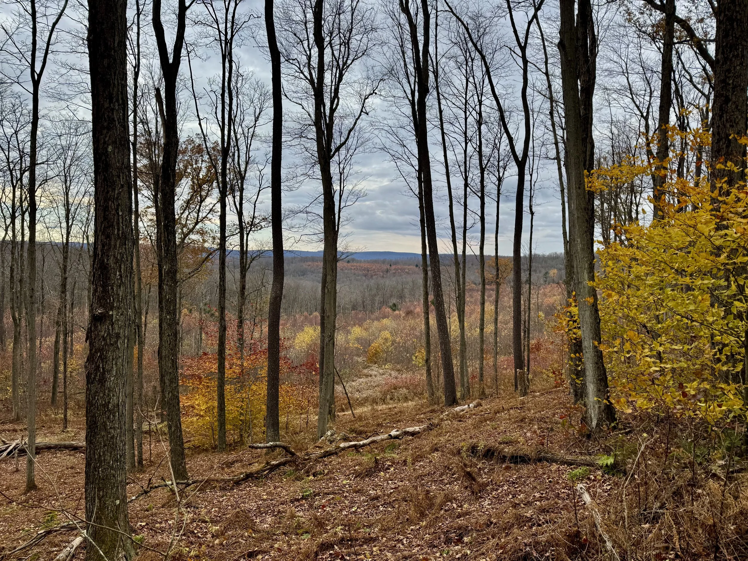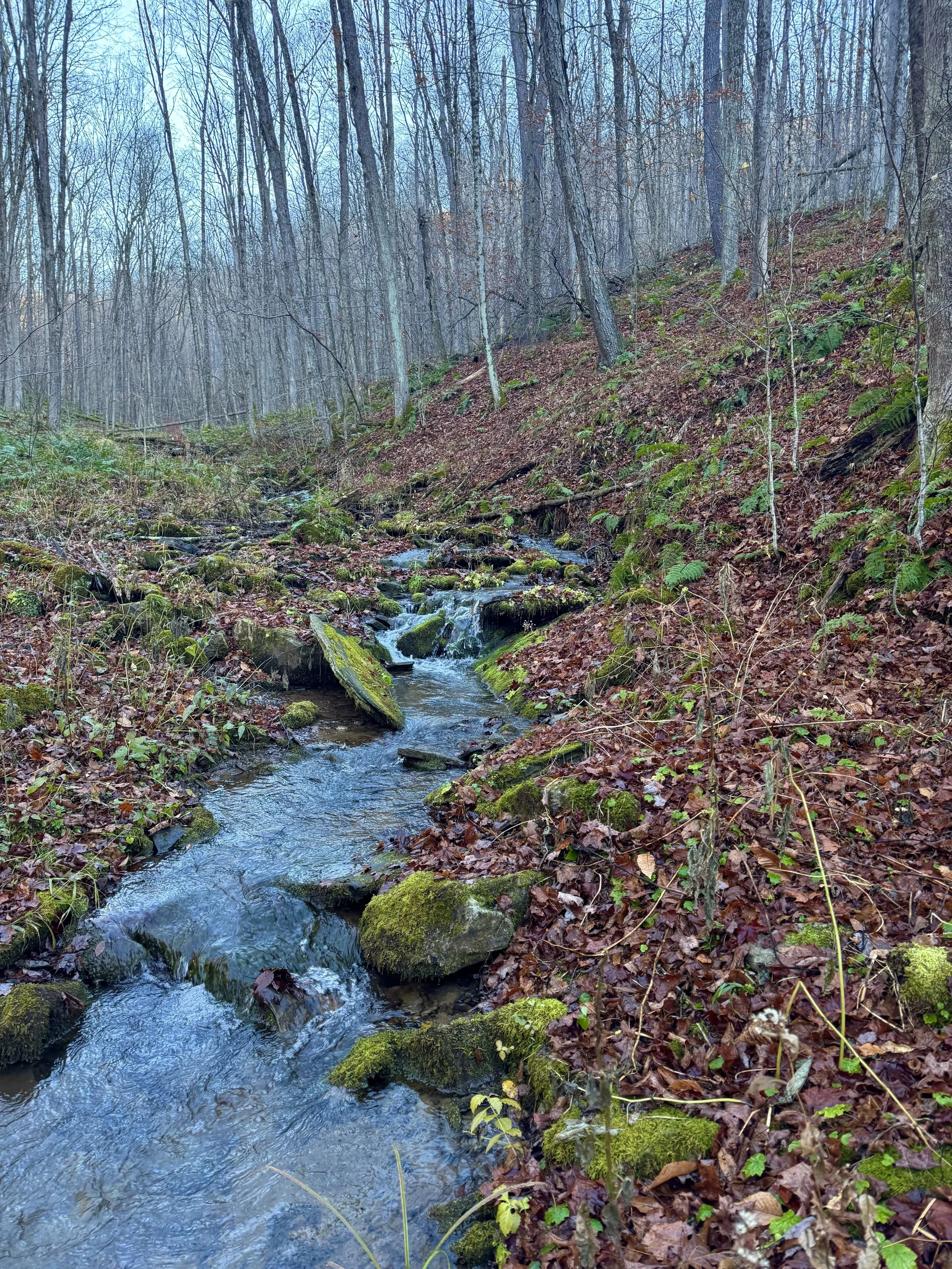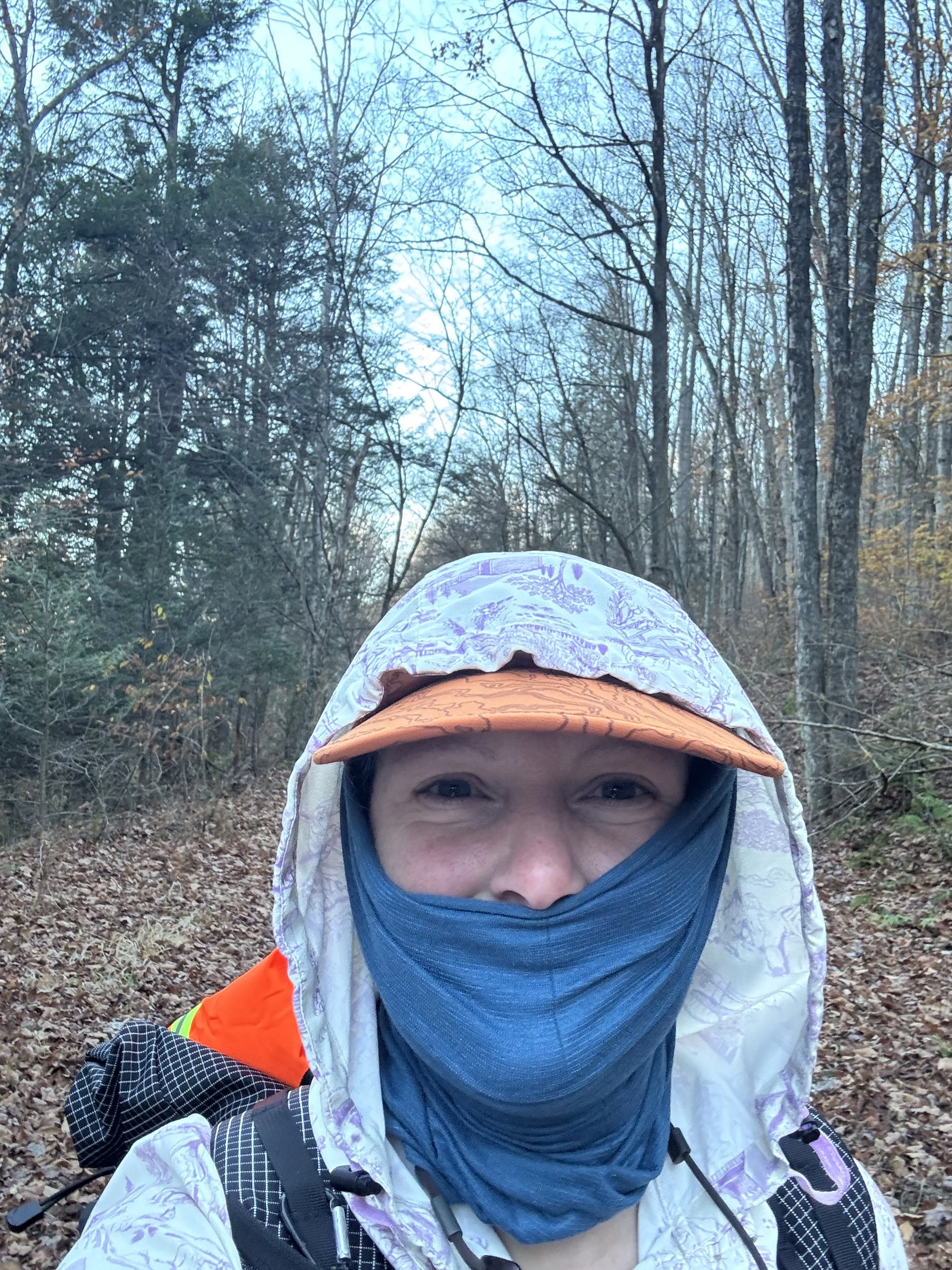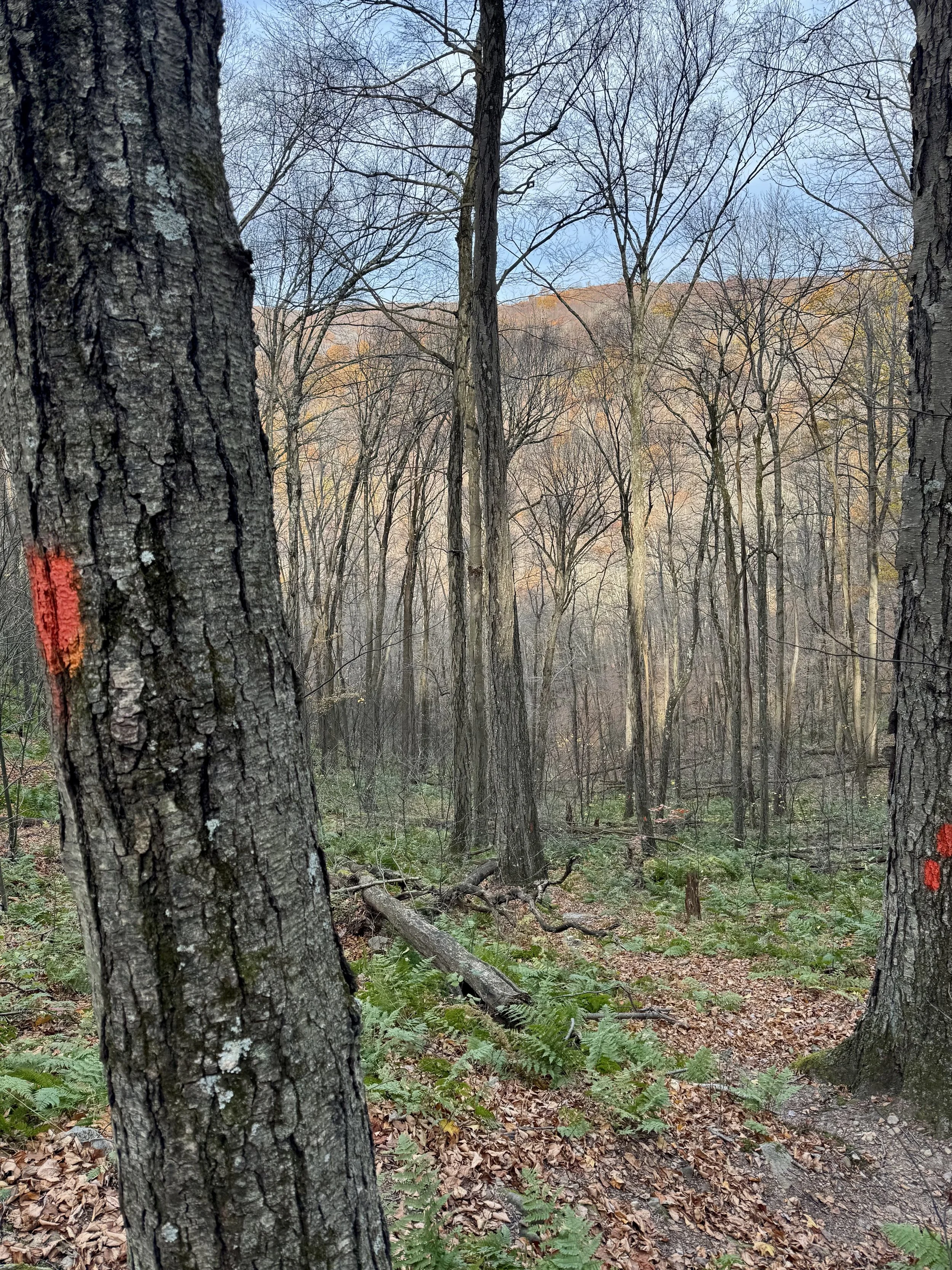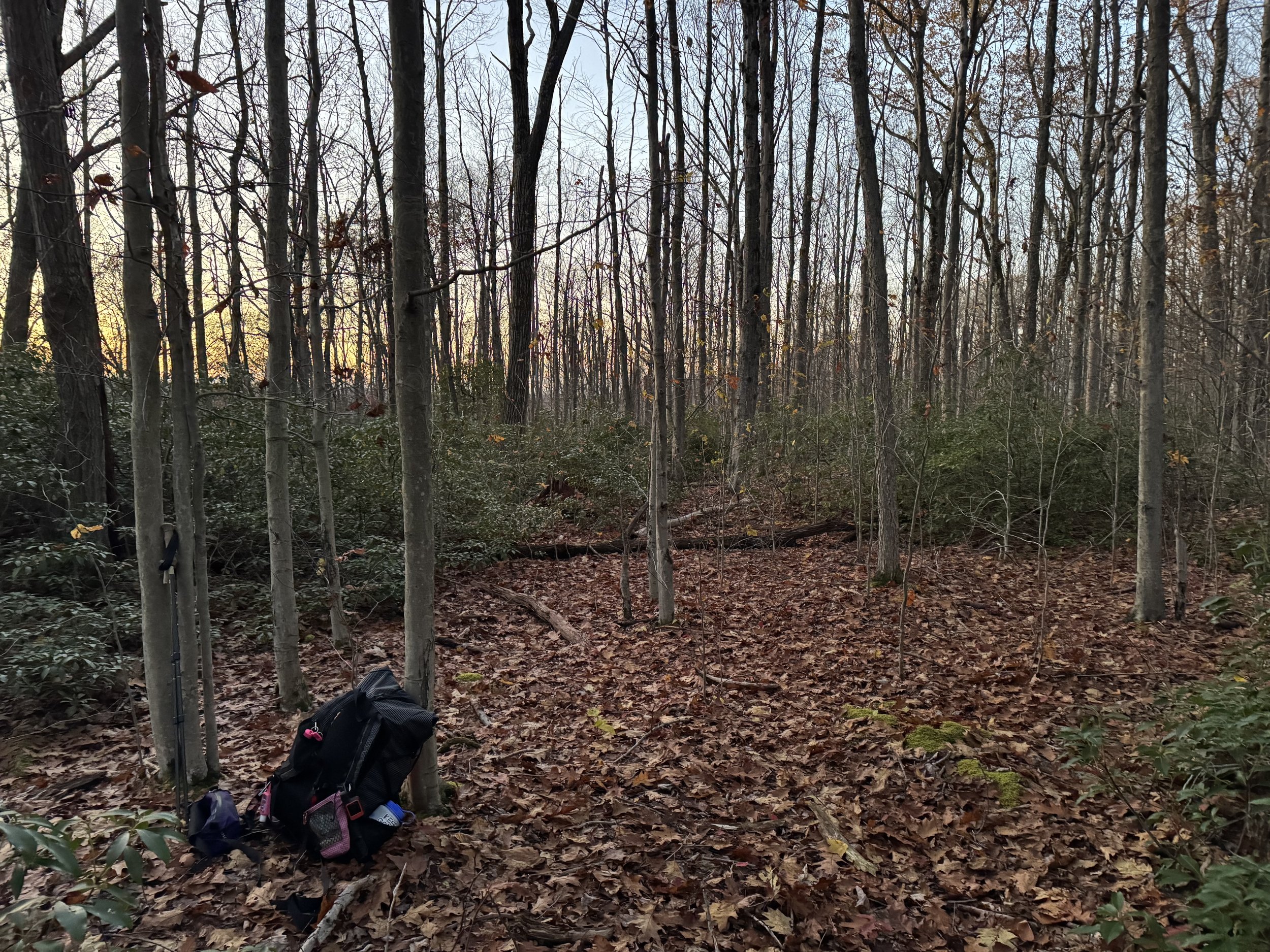 I had woken up a few times in the night to the wind picking up outside my dyneema walls. It didn't seem like a concern, and I did a pretty good sweep for widow makers before setting up where I did. I had my alarm set for 0545 to maximize daylight hiking time. I woke up then but was too cozy and didn't start packing until light started appearing. I was on trail though not too long after I wanted to be. It was still a hair before sunrise, 0634. I finished the ridge walk with the wind from the night continuing on through the day. The drop down to the W Branch Road was the typical East coast hiking I so remember. Halfway down I saw a sign saying this was Cardiac Climb. This led to a nice internal debate while I scrabbled and slipped down the rocks and wet leaves as to whether I'd rather have a steep up and switch back down or vice versa. Jury's still out on which is better for me, but I will say the best is when both are a nice grade. It was very cold down in the valley and across W Branch Road. I was glad to have camped on the ridge. Frost glistened on the grass and leaves around me. Climbing back up to the next ridge was a relief from the cold. The rest of the morning wasn't overly memorable, but still enjoyable. The forest was very pretty despite being a week or two past its fall prime. Steep down then slow up eventually crossing Ridge Road and Thompson Hollow Road where I saw the first bit of human life since starting. A car was parked on the road. A short bit later I reached the spot marked as a vista. I took the short path over but was mildly disappointed to not have much of a view. Really, it was similar to what I had been seeing. I turned back and carried on up the trail. A little later, I ran into the owners of the car, Two guys out bow hunting. We exchanged pleasantries where I said I'd be hiking at least 10 more miles, though in actuality it ended up being 17 more miles from that point. I wasn't just being cagey for my safety; I hadn't actually decided where to stop for the night. Not long after, at 1111, I came across my first trail register at the standard starting location for this hike. It's completely possible there were others, but I didn't see them. I signed in as Porcupine, my trail name bestowed upon me during the PCT where I continuously had holes in my inflatable gear. Therm-a-rest eventually just gave me a new pad since I had so much tape around the valve. Carrying on, it definitely felt like it could be a busier area with more trail junctions. I didn't see anyone. It was a cold late fall day where my mittens came off for a total of 10 minutes all day, well maybe 30 if I include lunch time.