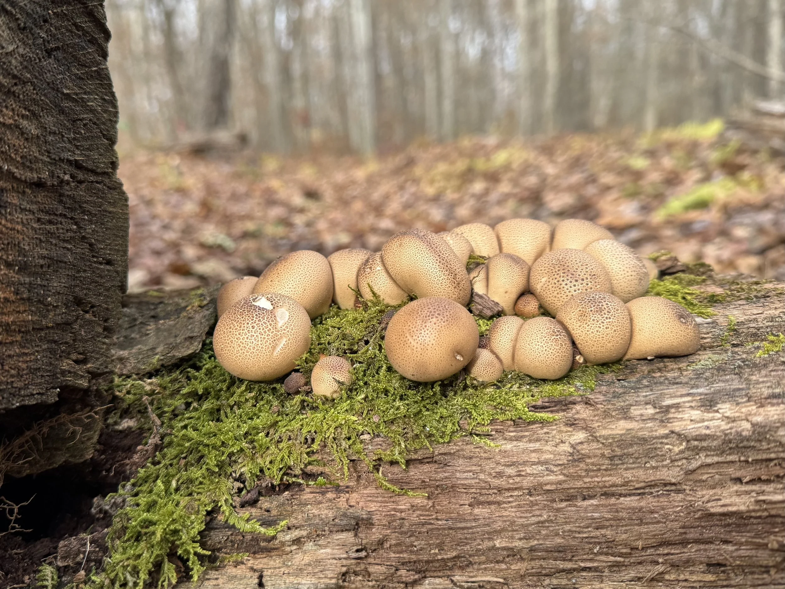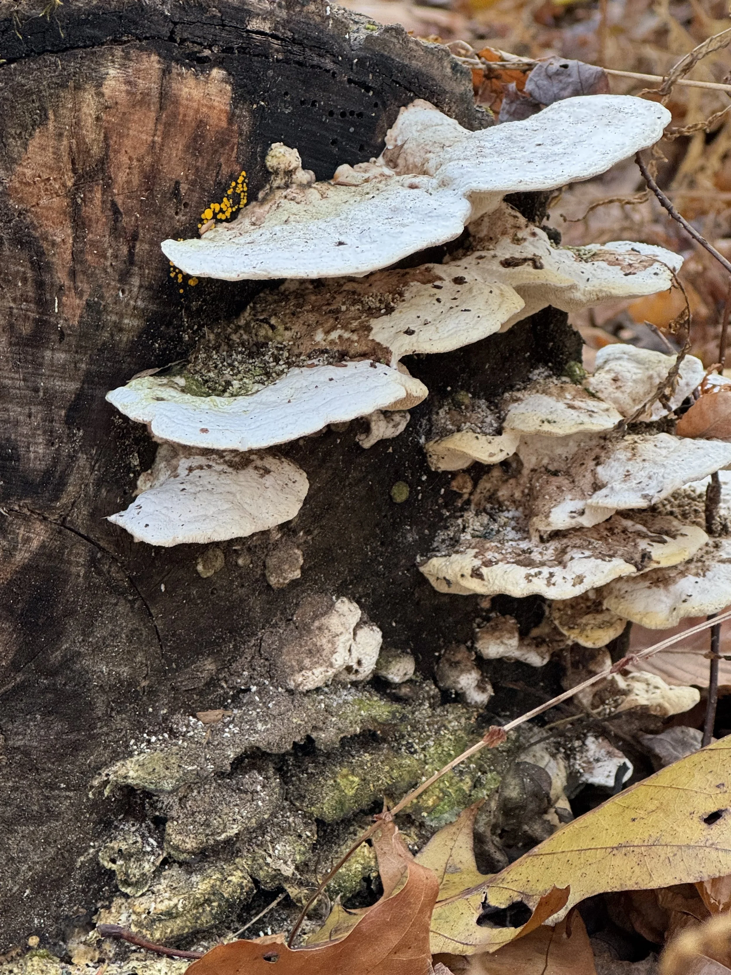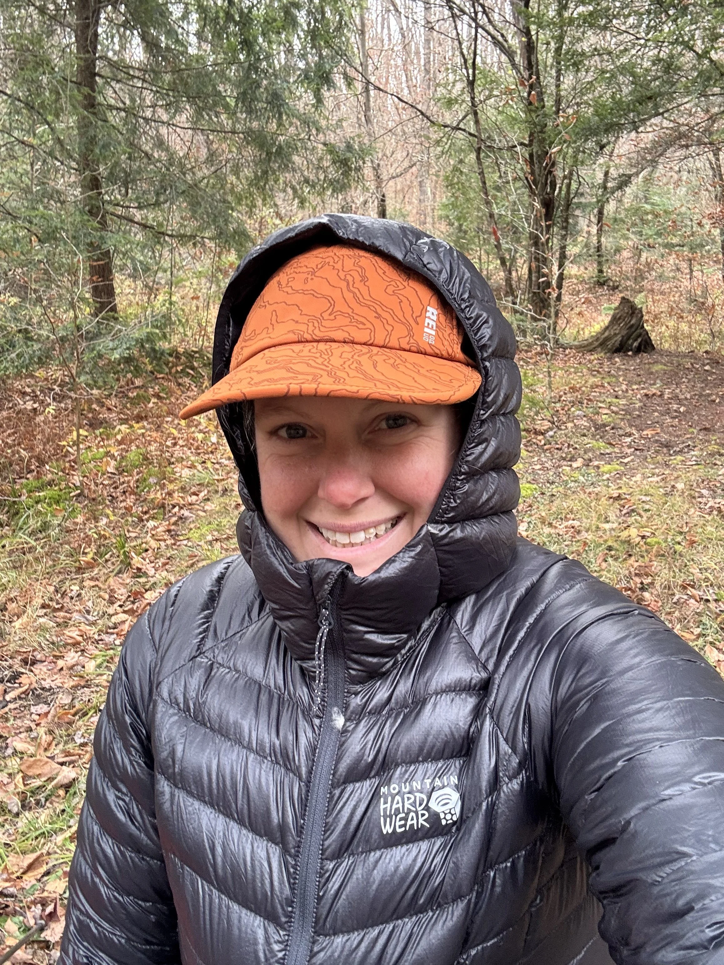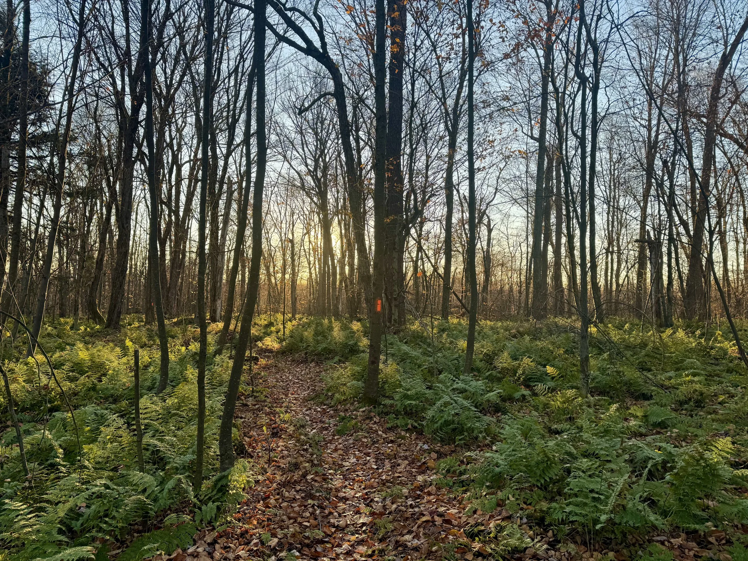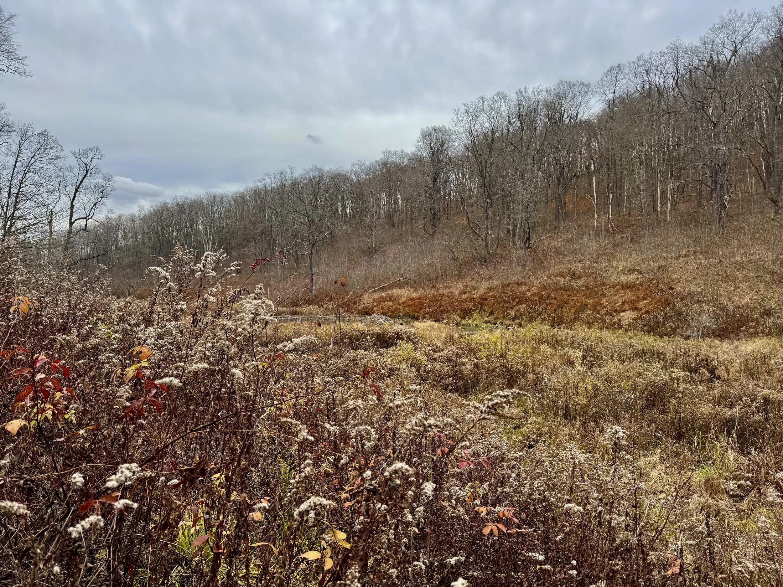 I had woken up a few times in the night to the wind picking up outside my dyneema walls. It didn't seem like a concern, and I did a pretty good sweep for widow makers before setting up where I did. I had my alarm set for 0545 to maximize daylight hiking time. I woke up then but was too cozy and didn't start packing until light started appearing. I was on trail though not too long after I wanted to be. It was still a hair before sunrise, 0634. I finished the ridge walk with the wind from the night continuing on through the day. The drop down to the W Branch Road was the typical East coast hiking I so remember. Halfway down I saw a sign saying this was Cardiac Climb. This led to a nice internal debate while I scrabbled and slipped down the rocks and wet leaves as to whether I'd rather have a steep up and switch back down or vice versa. Jury's still out on which is better for me, but I will say the best is when both are a nice grade. It was very cold down in the valley and across W Branch Road. I was glad to have camped on the ridge. Frost glistened on the grass and leaves around me. Climbing back up to the next ridge was a relief from the cold. The rest of the morning wasn't overly memorable, but still enjoyable. The forest was very pretty despite being a week or two past its fall prime. Steep down then slow up eventually crossing Ridge Road and Thompson Hollow Road where I saw the first bit of human life since starting. A car was parked on the road. A short bit later I reached the spot marked as a vista. I took the short path over but was mildly disappointed to not have much of a view. Really, it was similar to what I had been seeing. I turned back and carried on up the trail. A little later, I ran into the owners of the car, Two guys out bow hunting. We exchanged pleasantries where I said I'd be hiking at least 10 more miles, though in actuality it ended up being 17 more miles from that point. I wasn't just being cagey for my safety; I hadn't actually decided where to stop for the night. Not long after, at 1111, I came across my first trail register at the standard starting location for this hike. It's completely possible there were others, but I didn't see them. I signed in as Porcupine, my trail name bestowed upon me during the PCT where I continuously had holes in my inflatable gear. Therm-a-rest eventually just gave me a new pad since I had so much tape around the valve. Carrying on, it definitely felt like it could be a busier area with more trail junctions. I didn't see anyone. It was a cold late fall day where my mittens came off for a total of 10 minutes all day, well maybe 30 if I include lunch time.