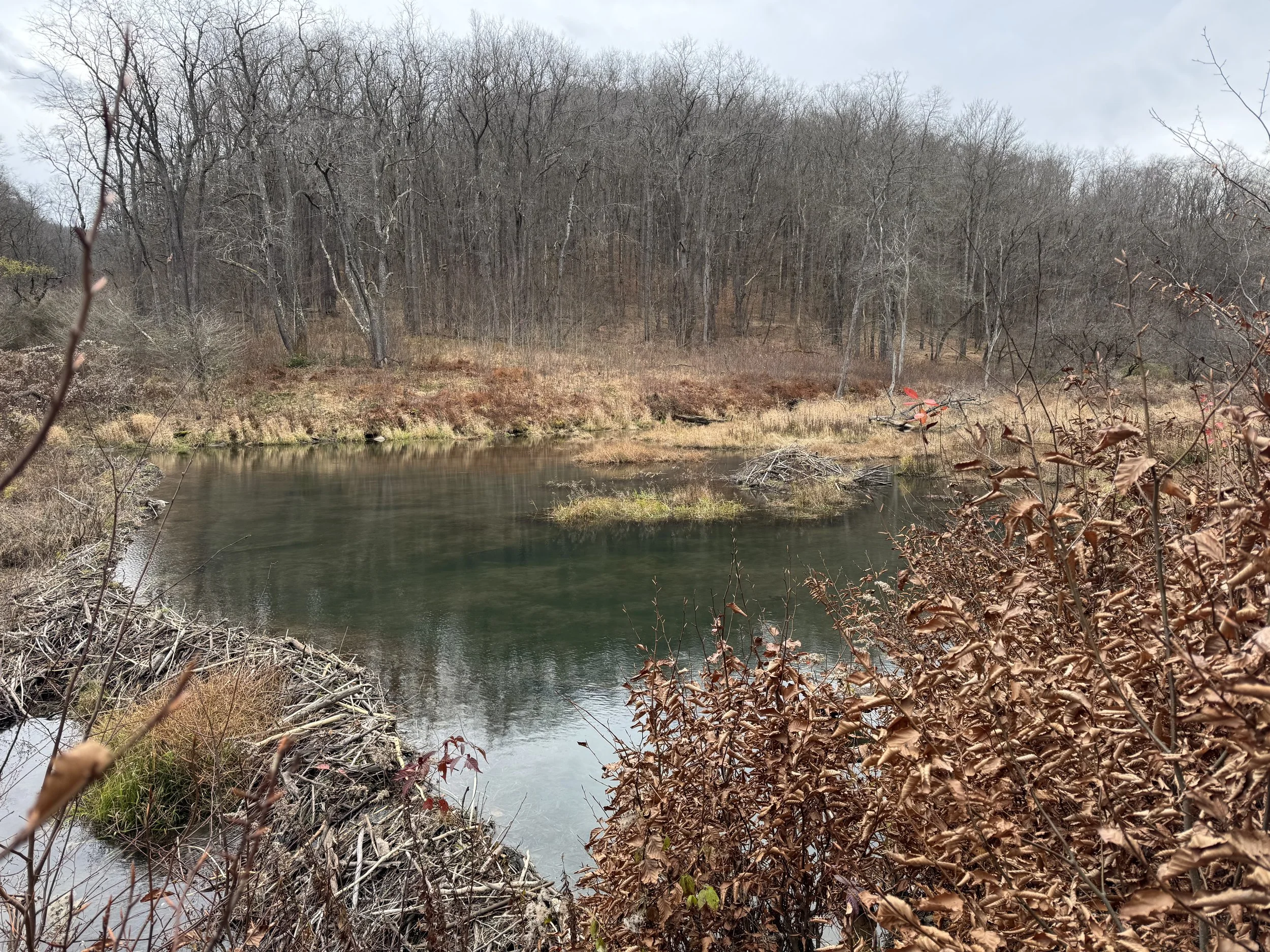 The highest point on trail (2563') was the next high point of the day around 1140. It wasn't obvious, but I enjoyed it being marked on my map. It was reminiscent of the high point of the OR/WA sections of the PCT, just a random spot in the woods without a view. Following any high point means a drop in elevation. Heading down what's marked as Leave Hollow on Far Out led to a larger open area and stream. It was quite pretty looking out over the water. The trail followed along the stream where I saw a large number of beaver dams and pools and a few lodges, no beavers though.