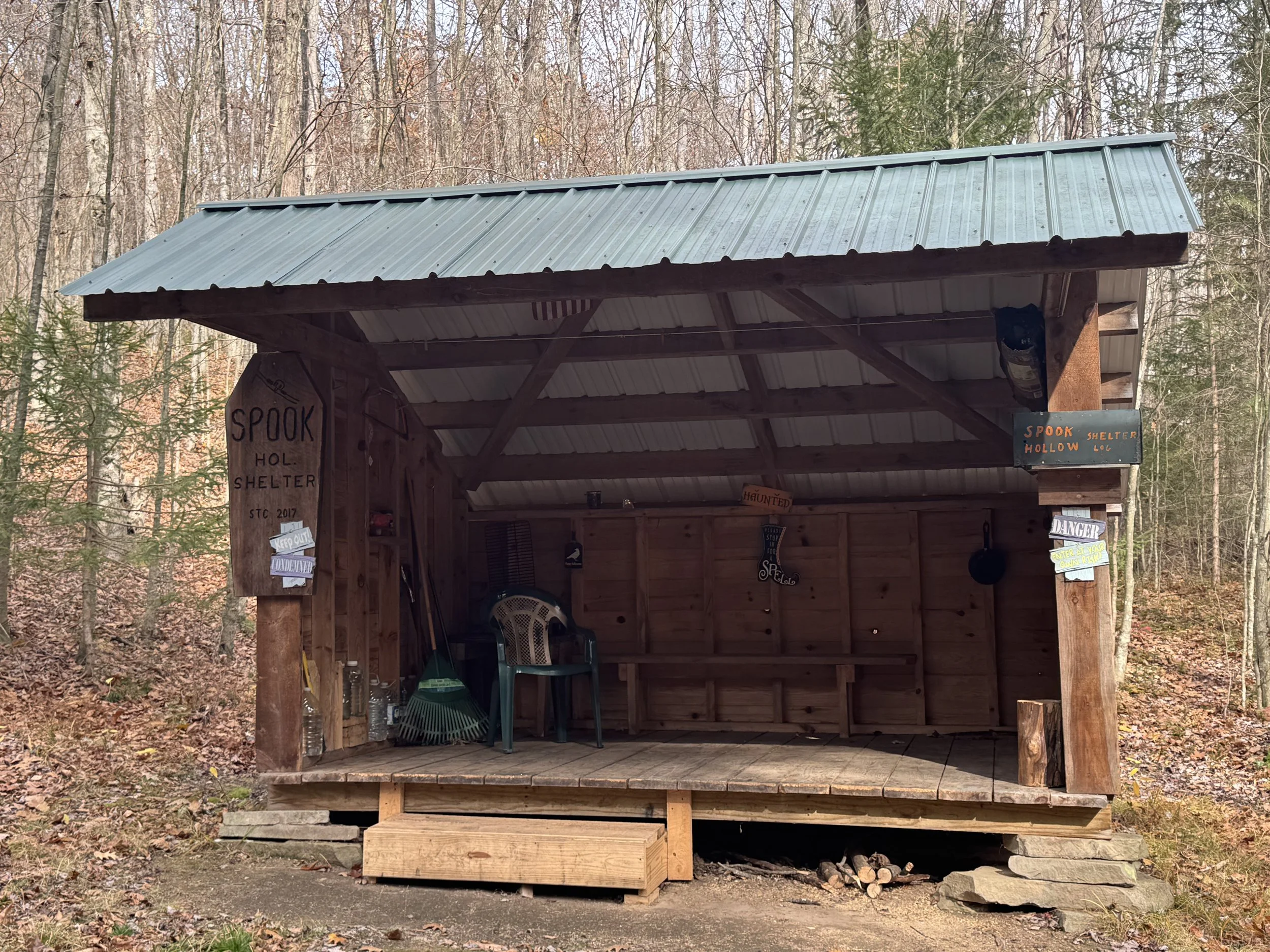 The walking got easier and I cruised through the woods at a pretty fast pace. I put on some happy music to enhance the experience and enjoyed the walk fully. I got to a really cool coniferous hollow which I learned once I exited was called Spook Hollow just before noon. The shelter there was cute and decorated accordingly.