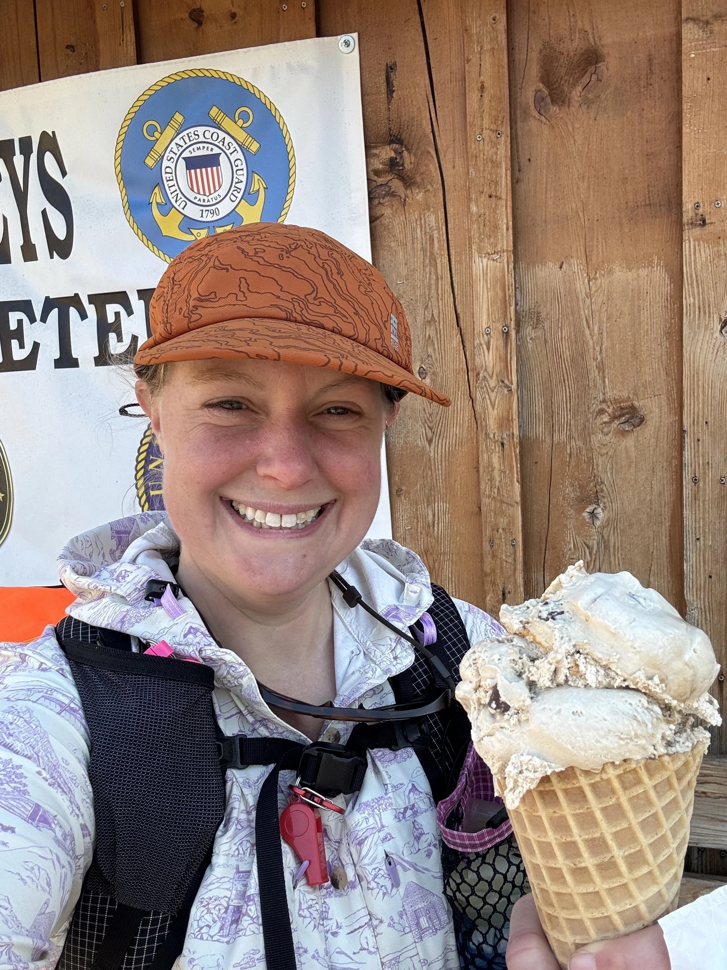 I don't remember much more of the morning and early afternoon since my goal was town for snacks. I listened to a few more podcasts while walking a little above the very pretty waterways and along the slopes. Even the flatter areas on this trail aren't typically fast. There are a lot of rocks and roots hidden under all those leaves. There was one ridge that stands out a bit more since it had a lot of conifers which contrasted to the largely deciduous forests I had been traversing. On the descent down to Cross Fork, I came across three guys. I stopped and chatted briefly, finding out that they started at the same place as me but were going clockwise. They were hiking it together and going to be out for I think 5 days. They congratulated me on my near finish. I still had a bit to go, but would be back at my car in less than 24 hours. Town was very shortly after meeting them. Four cars passed by on my way in and at 1430, I eventually reached the spot I'd been looking forward to, the little shop, and it was open! I wandered around looking at all the souvenirs I wouldn't be buying, before grabbing some salt and vinegar chips, a sweet tea (my go to town drink), and of course, ice cream! The one scoop of brown butter bourbon Hershey's ice cream was massive in its waffle cone. I sat out front for maybe 10 minutes and ate my ice cream in the sun, though I'd eat ice cream in any weather. The day had warmed up nicely and there wasn't much wind.