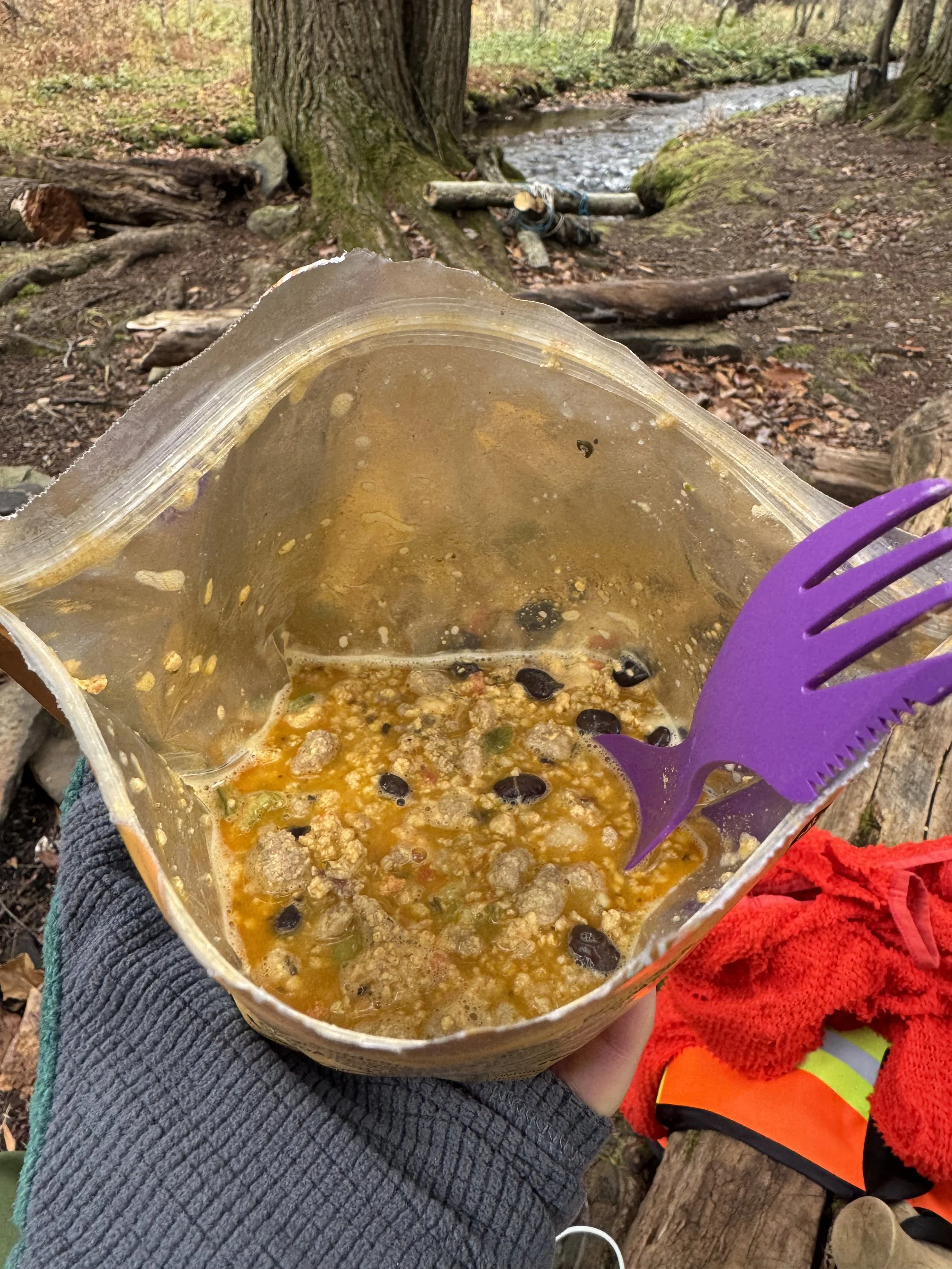 I stopped for lunch around 1230 where the trail turned across the stream. I put on my puffy and heated up a scrambled egg backpacker meal. It exceeded expectations in flavor despite adding too much water. I still question the posted calorie count though.
