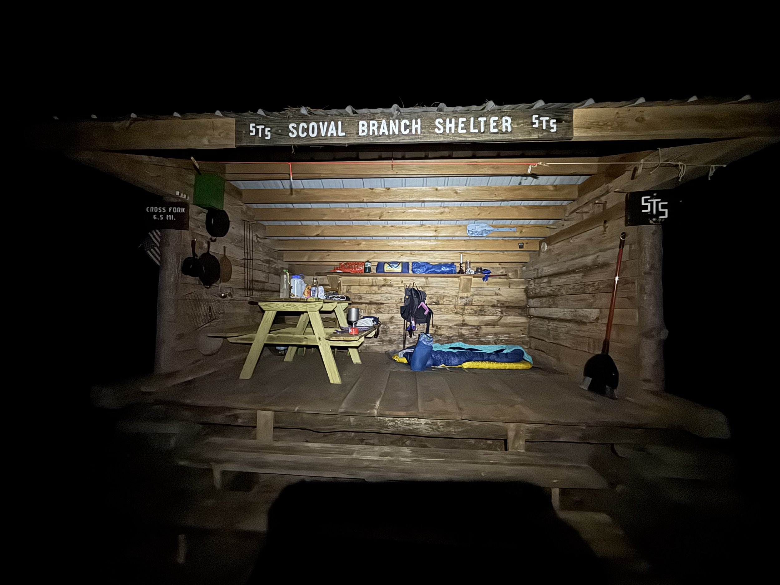 The afternoon was lovely. I finished my ice cream on trail and enjoyed the beauty of the woods and comfortable hiking temperature. It was a long steady climb up to Shepard Road. There were so many leaves on the ground, I would have stacks of them collected on the pointy bottoms of my poles. I crossed the pipeline track and walked on the other road for a short span before the trail veered off again into the woods and along Porter Branch and then Osborne Branch. I was aiming for somewhere near the Scoval Branch Shelter to call it a night. It was pretty easy-going elevation wise, but parts were overgrown. I reached the shelter just about at sunset. Good timing today and I didn't leave too many miles to finish up the next day. Like the day before, I got dinner hydrating as I set up my sleeping area. I snacked on the chips and drank my tea while I waited as well. Dinner was a chicken pot pie meal that was quite tasty followed by a bunch of gummy candies for dessert. After cleaning up, I crawled into bed to watch a movie I had downloaded. I had a few things on my phone since I thought it'd be early nights with nightfall at 1700. Sleep was intermittent with the noises of coyotes occasionally waking me. They were far off though and I would fall back into sleep.